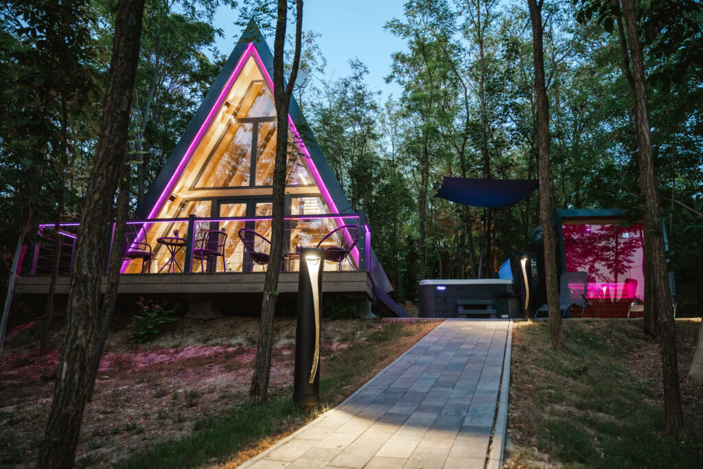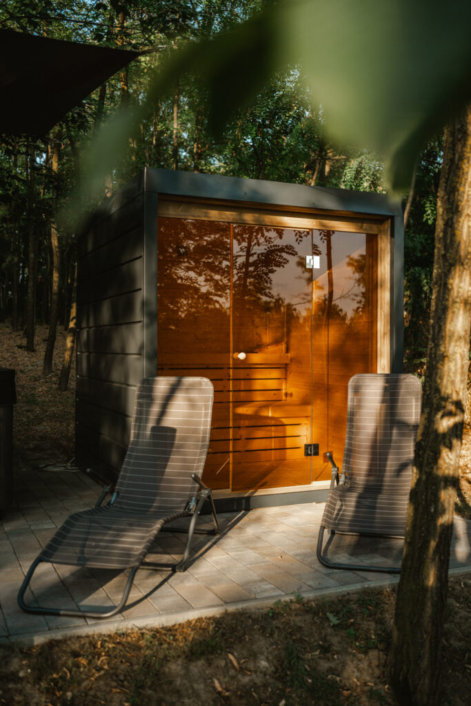 A szaunánk legnagyobb különlegessége, hogy közvetlen kilátást nyújt az érintetlen akácos erdőre. Az üvegfalakon keresztül élvezheted a természet szépségeit anélkül, hogy el kellene hagynod a meleg és kényelmes szaunát. Az év minden szakában varázslatos látvány fogad: a tavaszi virágzás és a lombozat friss zöldje, a nyári napsütés és a rétek tarka színei, az őszi levelek arany-sárga-vörös kavalkádja és a téli táj csendes, hófödte szépsége mind-mind különleges élményt nyújtanak.